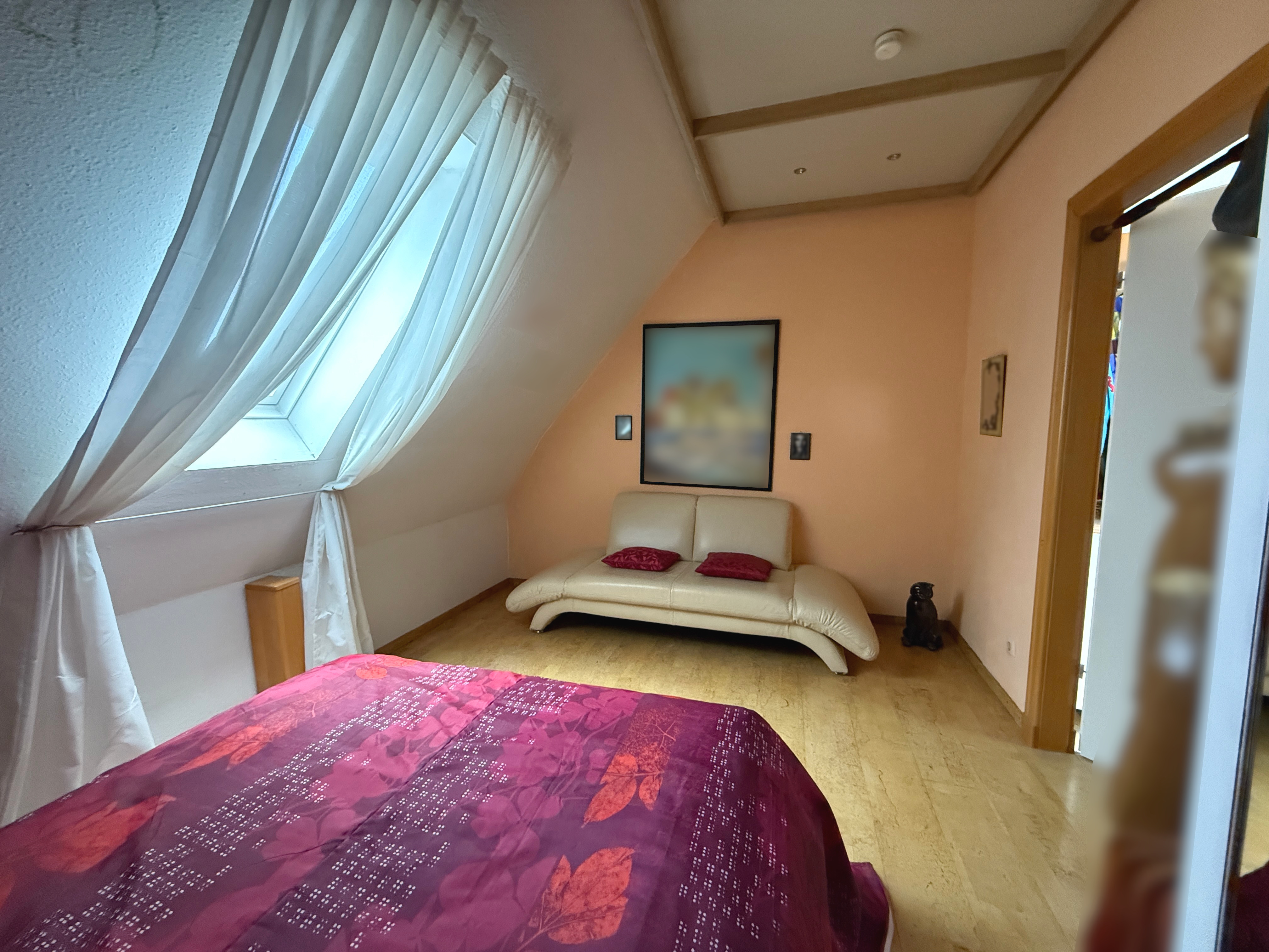 Über eine Treppe gelangen Sie in das gemütliche Schlafzimmer, welches Platz für ein Doppelbett und einen Kleiderschrank bietet.